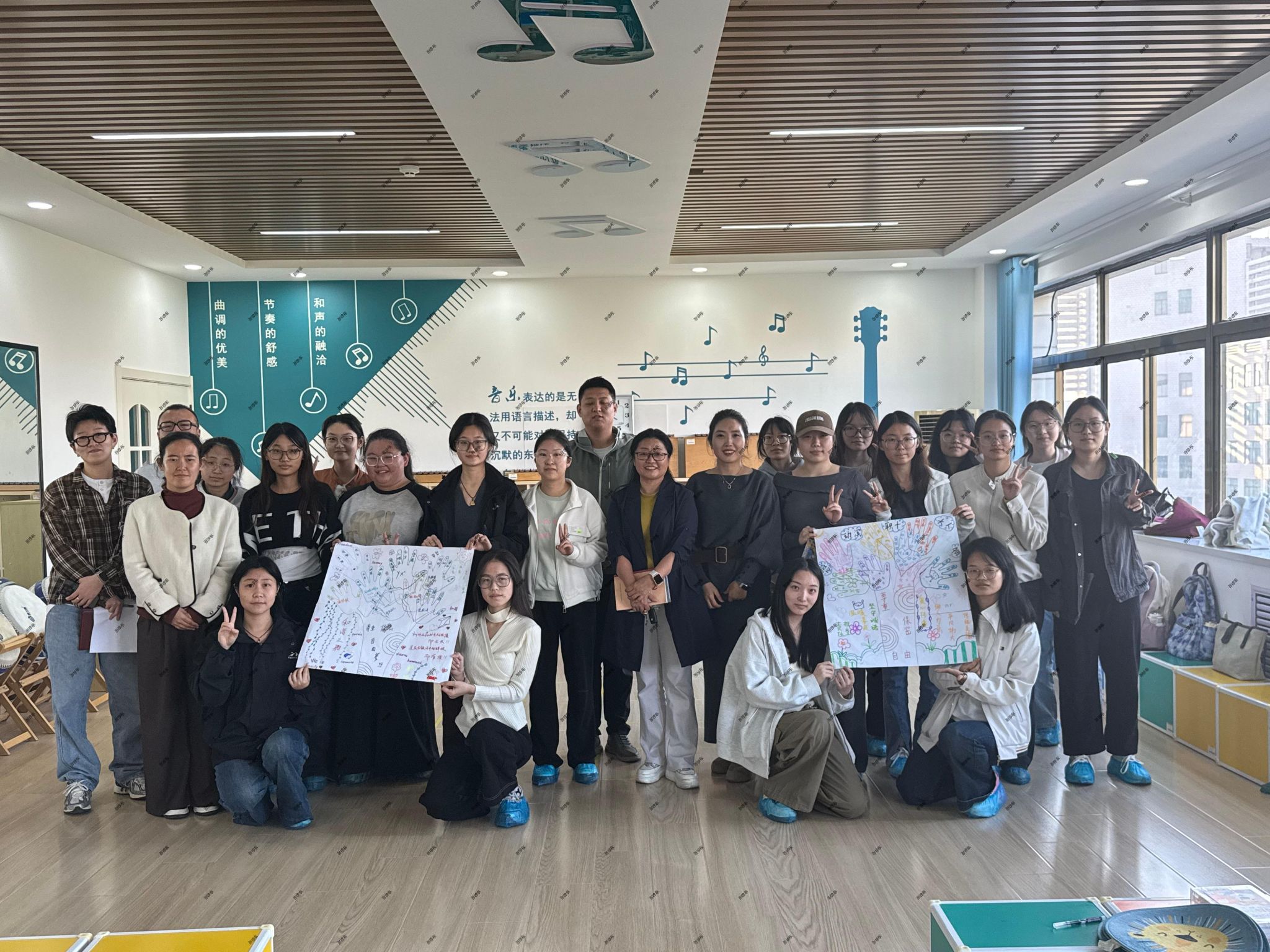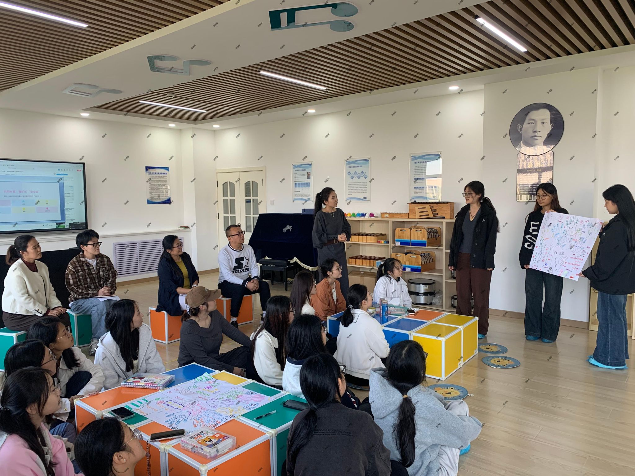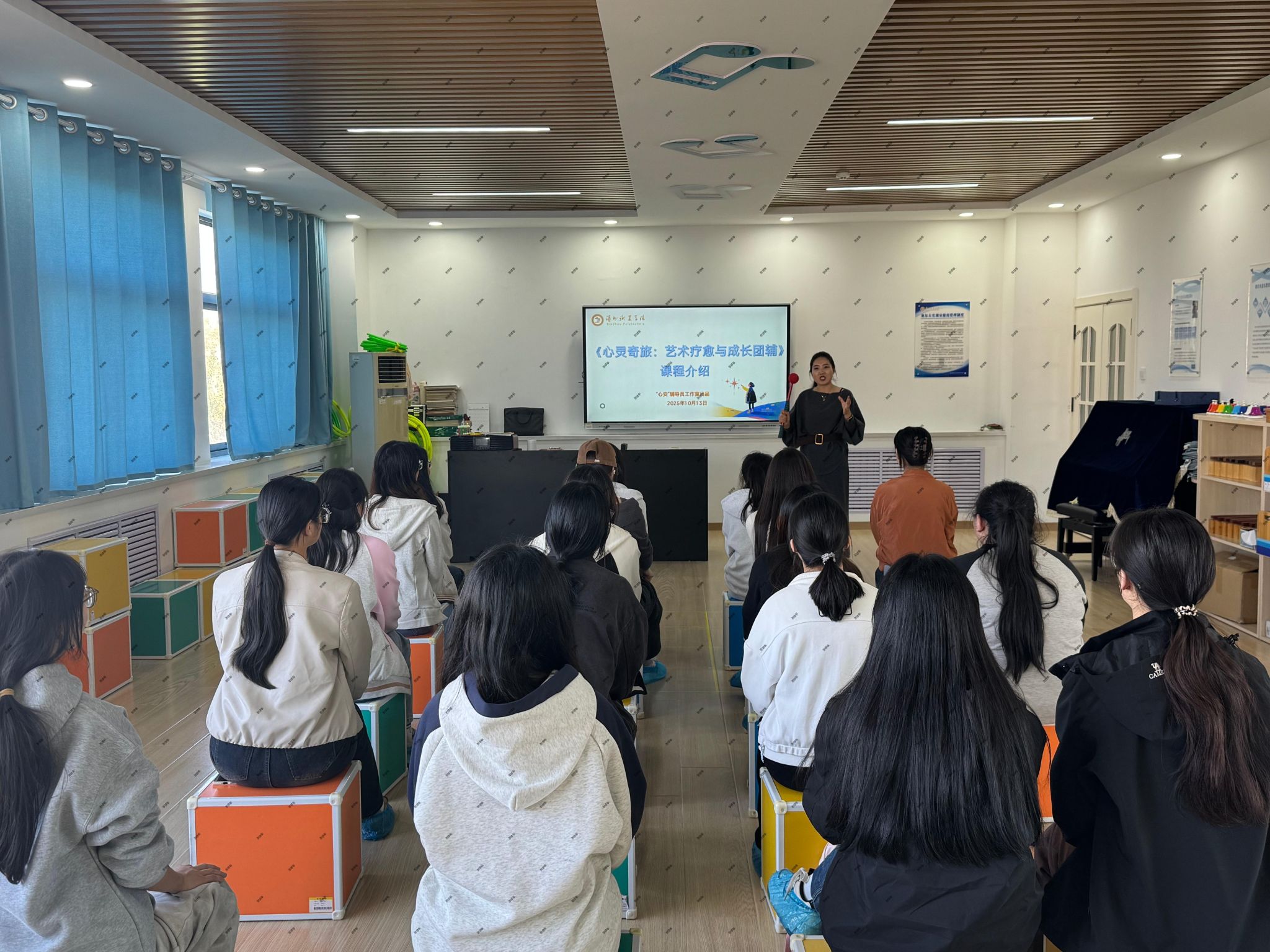 在开课前期,“心安滨职”辅导员工作室组建了两个专项备课小组,围绕课程目标、内容设计与教学方法开展集体研讨与精心打磨,系统完善了两门课程的《课程标准》、教学PPT及配套讲稿,为课程高质量实施奠定基础。《艺术疗愈与成长团辅》首次课程以《我们的约定之树:团体契约共创》主题,以艺术表达为媒介,引导员工在创作中探索自我、舒缓压力、建立联结,增强团队凝聚力。课堂上,同学们踊跃参与创作环节,积极分享个人感悟与作品内涵,在轻松而专注的氛围中共同完成了各具特色的“约定之树”。通过艺术表达与互动交流,同学们不仅加深了彼此的理解与信任,也在集体共创中收获了情感支持与自我觉察,整体课堂氛围热烈,班会效果显著。