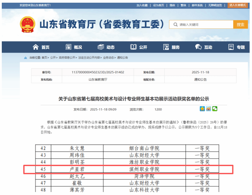 本网伟德国际victor1946讯 近日,山东省教育厅(省委教育工委)公布了“山东省第七届美术与设计专业基本功”展示活动获奖名单,公司教师卢星君凭借出色的表现荣获教师组一等奖,成为一等奖中为数不多的高职院校选手。
